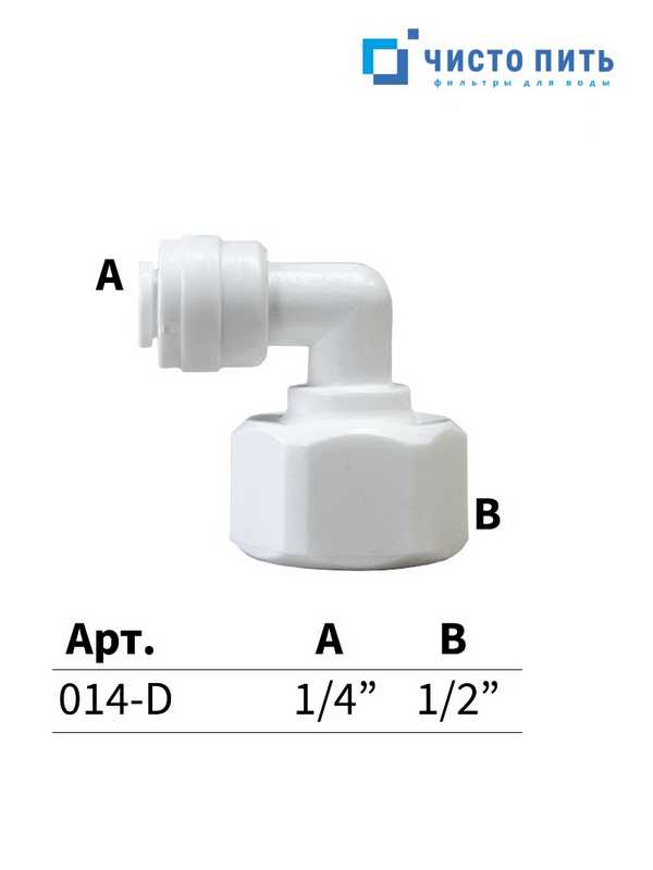Фитинг угловой для фильтра 1/2" внутренняя резьба х 1/4" цанга трубка используется в проточных фильтрах и системах обратного осмоса.