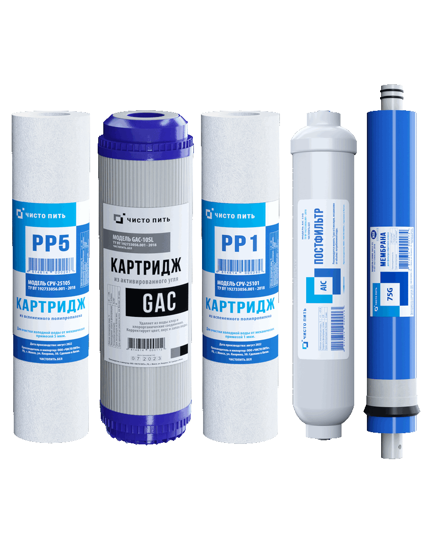 Комплект предварительных картриджей ЧИСТО ПИТЬ серии M с постфильтром и мембраной 75GPD (284 л/сутки) для фильтра обратного осмоса с одной угольной ступенью.