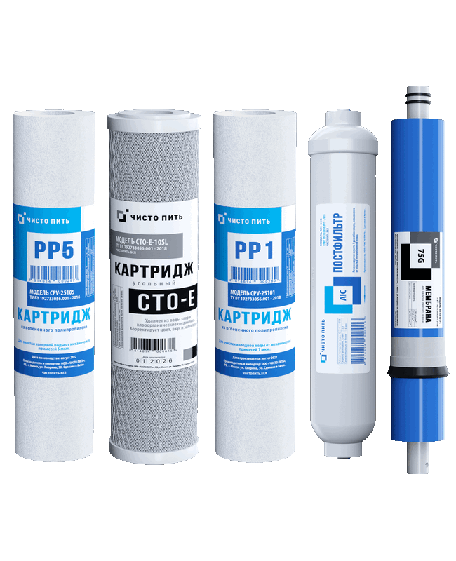 Комплект предварительных картриджей ЧИСТО ПИТЬ серии S с постфильтром и мембраной 75GPD (284 л/сутки) для фильтра обратного осмоса.
