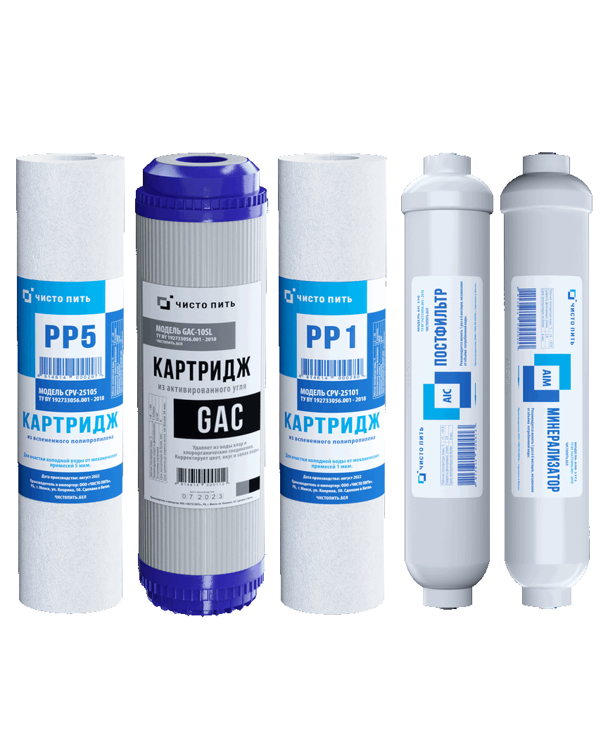 Комплект предварительных картриджей ЧИСТО ПИТЬ серии M с постфильтром и минерализатором для фильтра обратного осмоса с одной угольной ступенью.