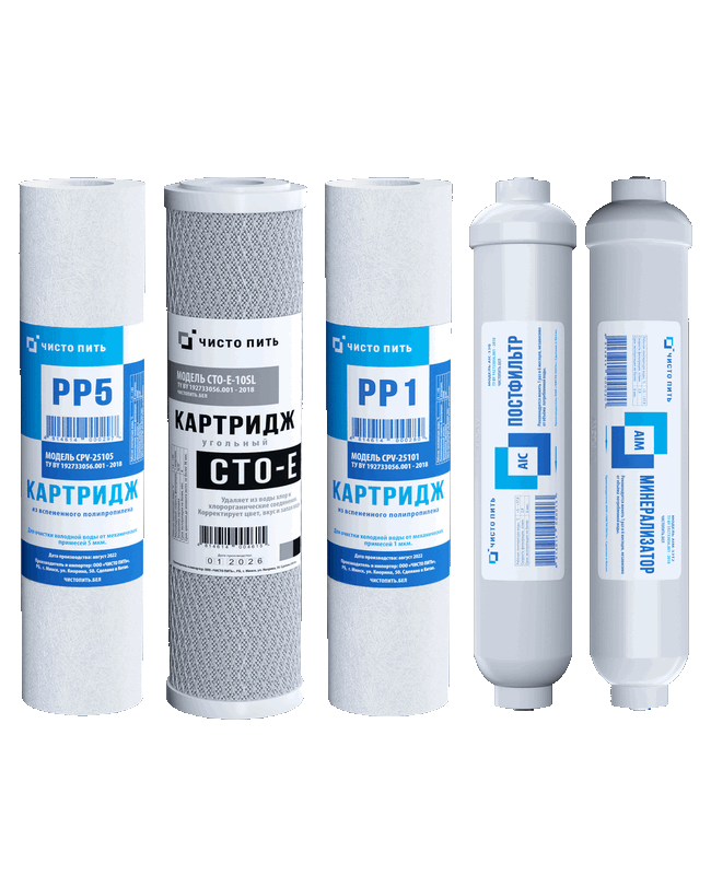 Комплект предварительных картриджей с постфильтром ЧИСТО ПИТЬ серии S для фильтра обратного осмоса обеспечивает базовую очистку воды перед мембраной.