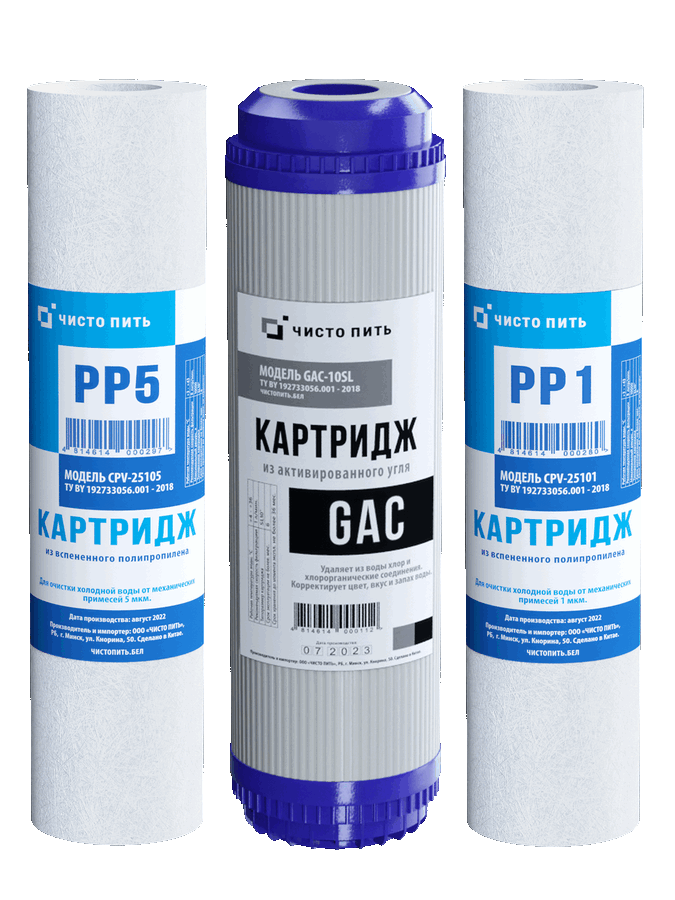 Комплект предварительных картриджей ЧИСТО ПИТЬ серии M для фильтра обратного осмоса с одной угольной ступенью.