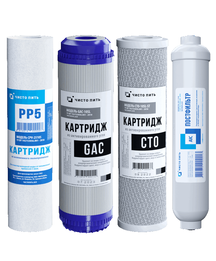 Комплект предварительных картриджей ЧИСТО ПИТЬ серии M для фильтра обратного осмоса с двумя угольными ступенями очистки.