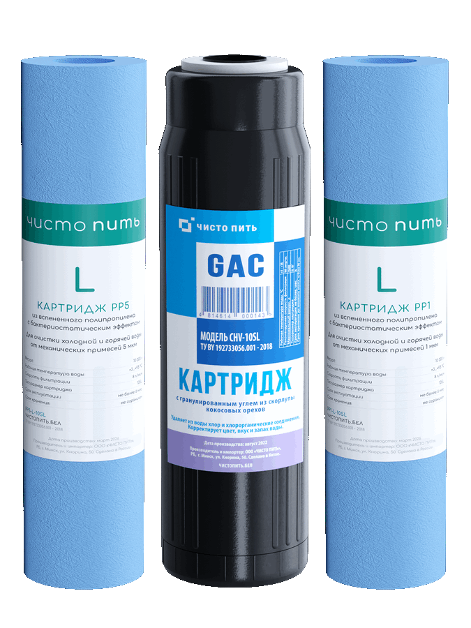 Комплект предварительных картриджей ЧИСТО ПИТЬ серии L для фильтров обратного осмоса отличается повышенным ресурсом и стабильным качеством очистки.
