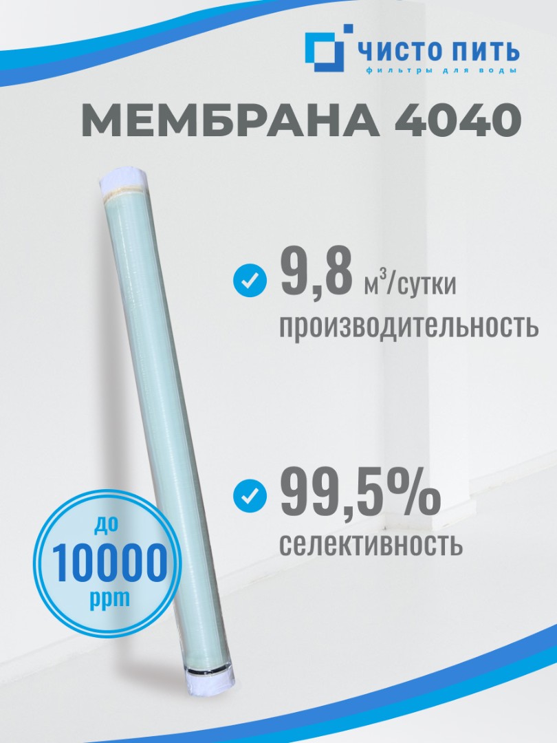 Промышленная мембрана обратного осмоса ЧИСТО ПИТЬ среднего/высокого давления 4040 серии BW - обладает большой производительностью и глубокой степенью деминерализации при сравнительно невысоком давлении 1,55 МПа/225 psi/15,5 атм.