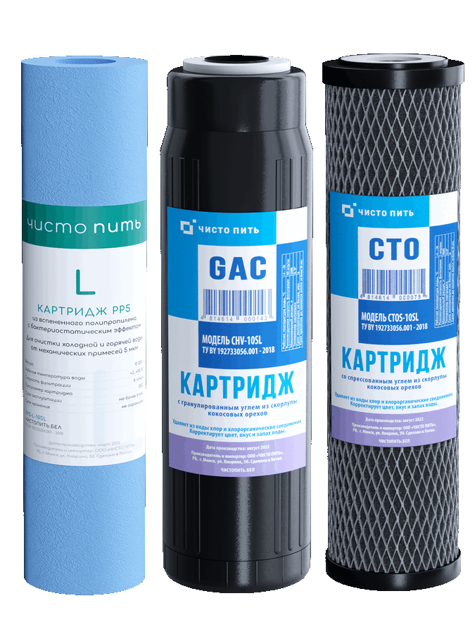 Комплект предварительных картриджей ЧИСТО ПИТЬ серии L для фильтров обратного осмоса отличается повышенным ресурсом и стабильным качеством очистки.