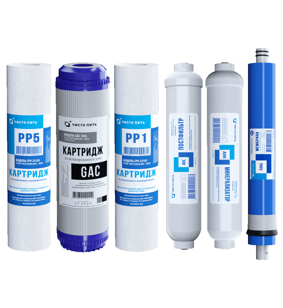 Комплект предварительных картриджей ЧИСТО ПИТЬ серии M с постфильтром, минерализатором и мембраной для фильтра обратного осмоса с одной угольной ступенью.